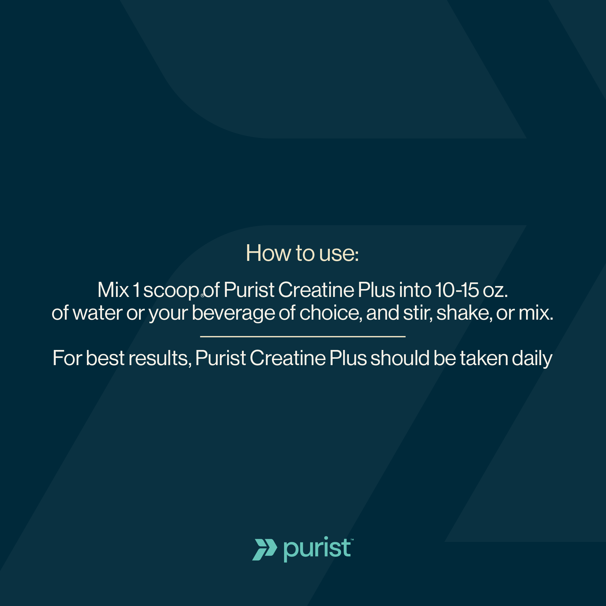 Mix 1 scoop of Purist® creatine+ into 10–15oz. of water or your beverage of choice, and stir, shake, or mix. For best results, Purist® creatine+ should be taken daily.