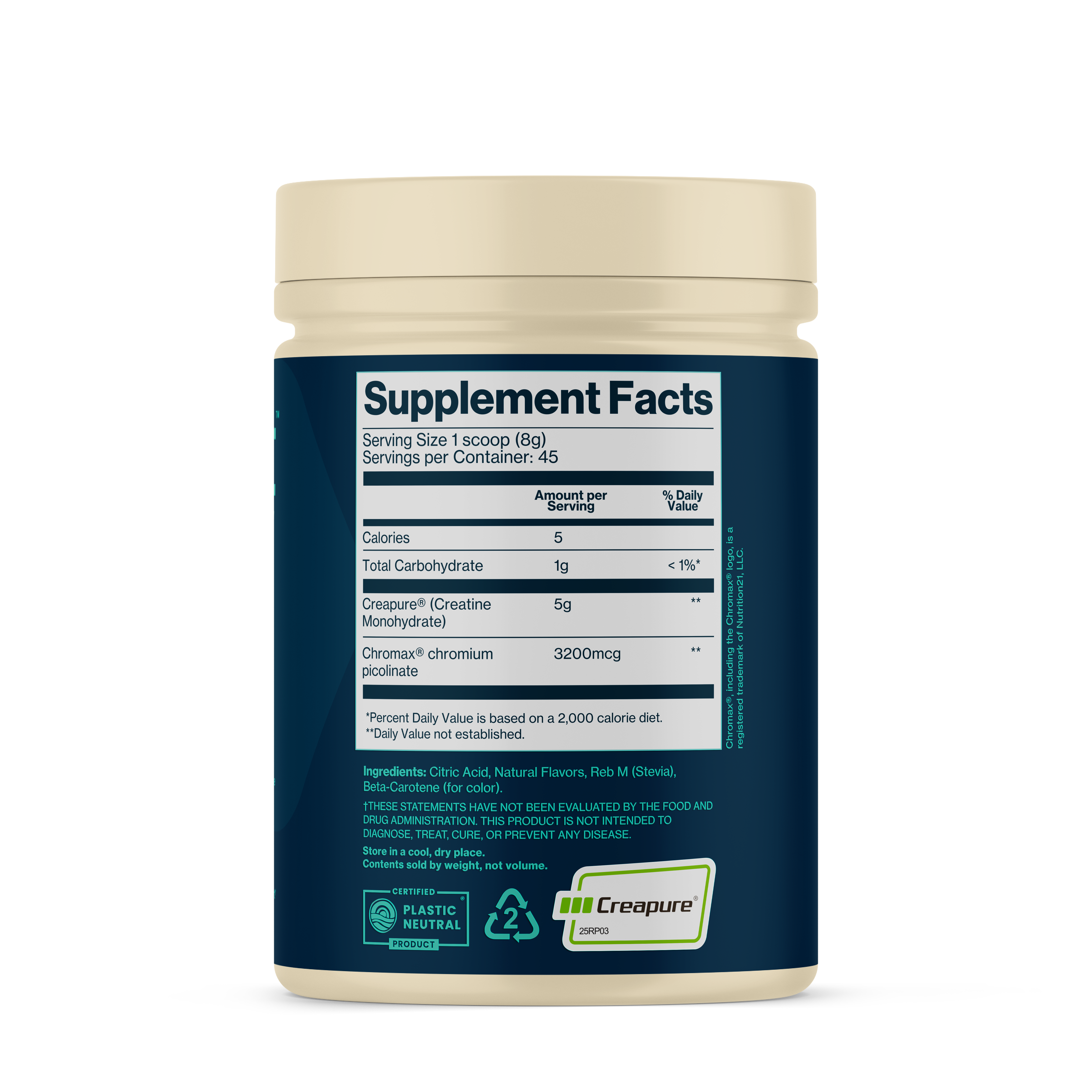 Chromax® chromium picolinate is a clinically studied ingredient, proven to support a healthy metabolism, improve body composition, and maintain lean muscle. By enhancing how your body uses glucose and burns fat, Chromax® complements the power of creatine for well-rounded performance and recovery. It’s part of what makes Purist® creatine+ more than just a strength supplement — it’s a complete, science-backed formula for real-life performance.