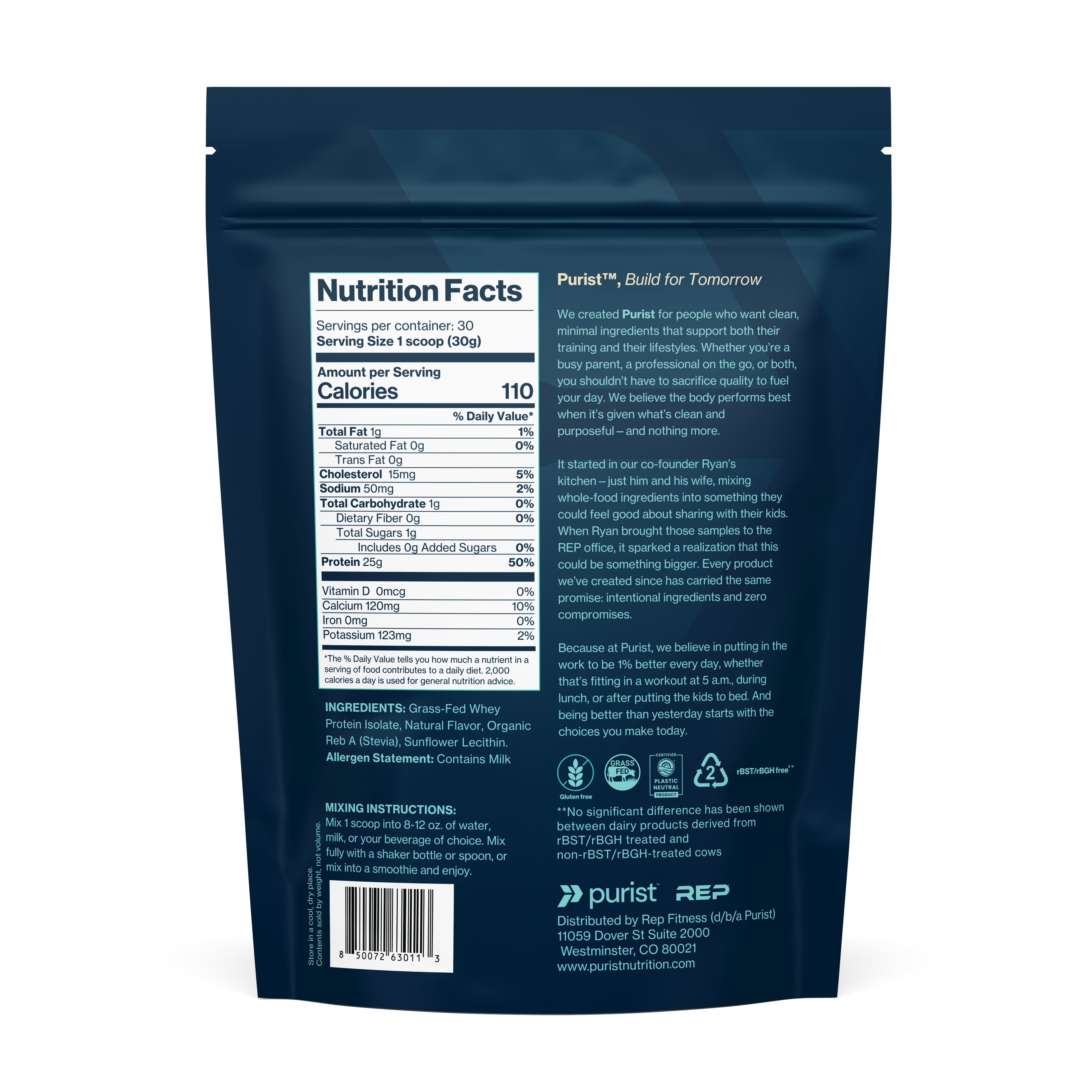 Purist® Grass-Fed Whey Protein Isolate helps you hit your daily protein goals with clean, fast-absorbing nutrition that fits your busy life. Each serving delivers 25 grams of premium grass-fed protein to support muscle recovery, strength, and long-term wellness — all without added sugar, gluten, soy, or artificial ingredients. Gentle on your gut, NSF Sport Certified, and trusted by athletes and everyday achievers alike. Made with sustainably sourced ingredients and Certified Plastic Neutral packaging, Purist® gives you confidence in what you’re putting in your body and pride in how you’re impacting the planet.