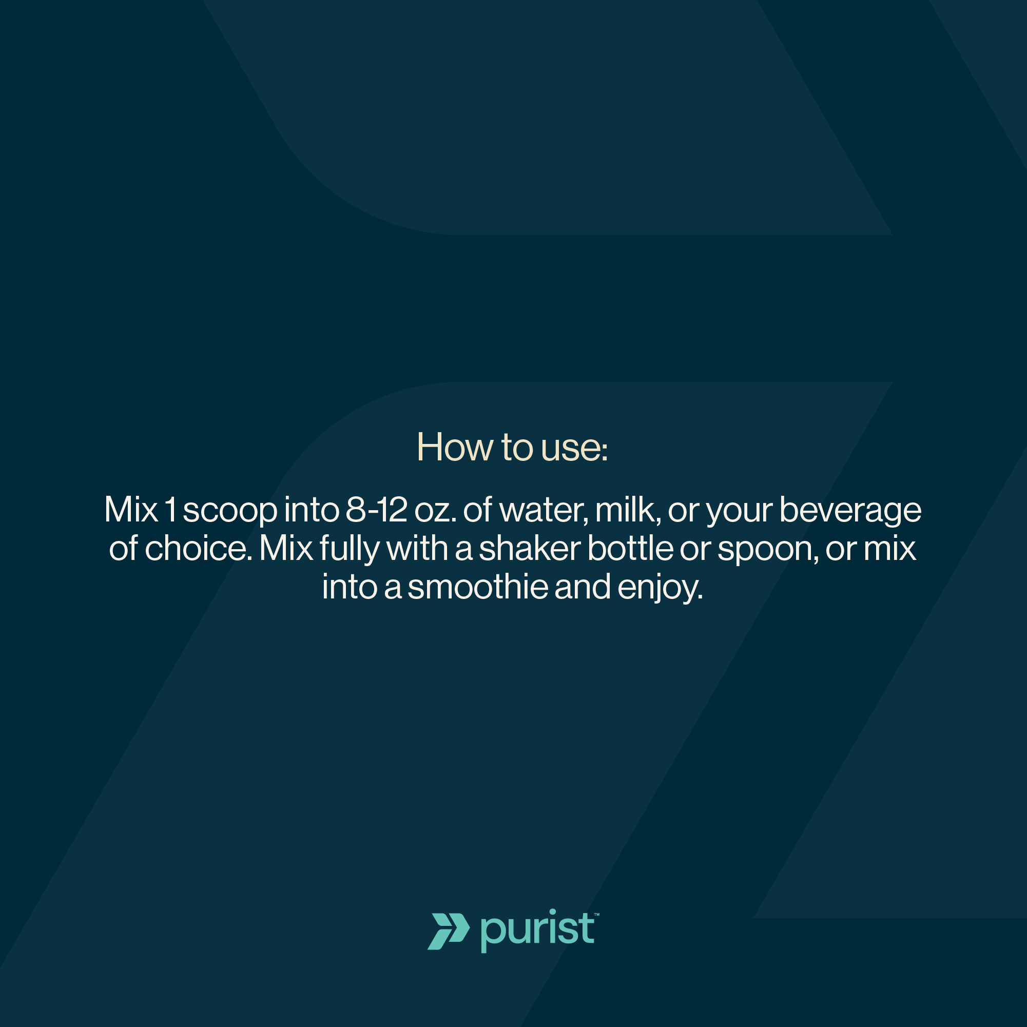 Mix 1 scoop into 8–12 oz. of water, milk, or your beverage of choice. Mix fully with a shaker bottle or spoon, or mix into a smoothie and enjoy.